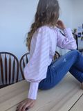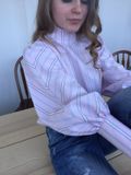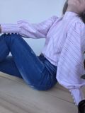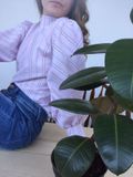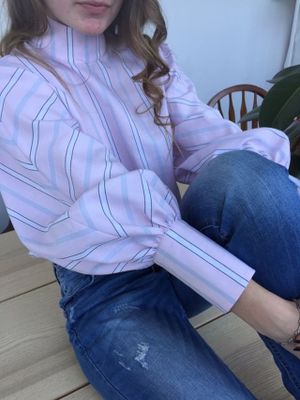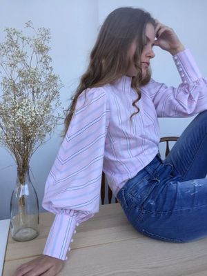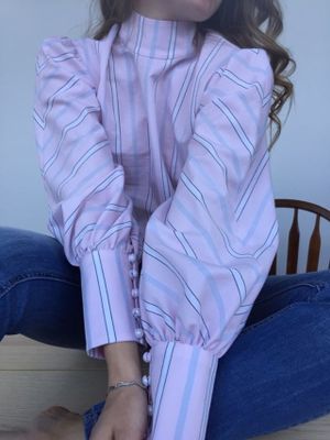 Блузка из розового хлопка с белой полоской. Приталенный лиф, аккуратный воротник-стойка и роскошные широкие рукава со стыковкой рисунка елочкой делают модель легкой и женственной. Прекрасный вариант для будущего лета.