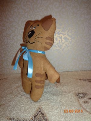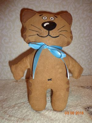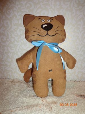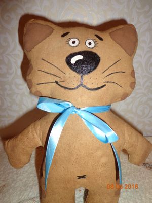 Белая бязь окрашена кофе с корицей ( имеет лёгкий аромат кофе), наполнитель - синтепух. Раскрашена вручную акриловыми красками по ткани DECOLA, контур и текст выполнены гелевой чёрной ручкой. Высота: 24 см., ширина 19 см., хвост 12 см