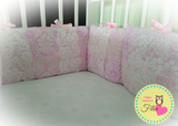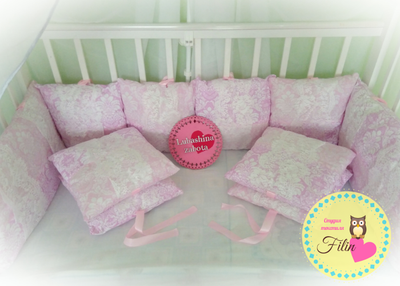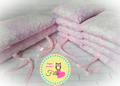 Набор бортиков на 4 стороны кроватки. Ткань поплин 100 %хлопок, декор белое кружево, способ крепления атласные ленты. Наполнитель файбер 1го сорта гипоаллергенный. Количество 10 подушек: 8-30*30, 2-30*60.