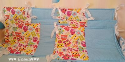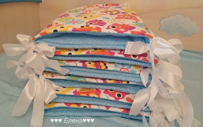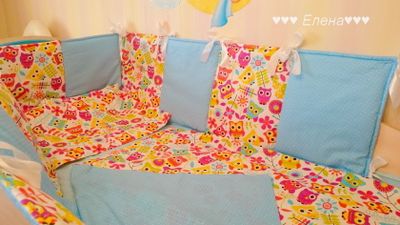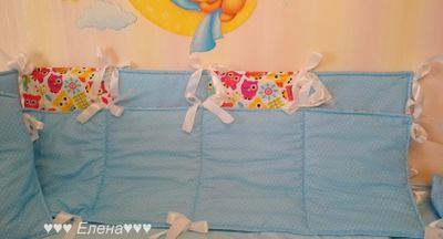 Бортики состоят из 4 частей : 2 части 120*40см , и 2 части 60*40см . На синтепоне . В комплект можно добавить балдахин ( стоимость 1800руб ) и постельное белье , стоимость 900 руб