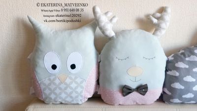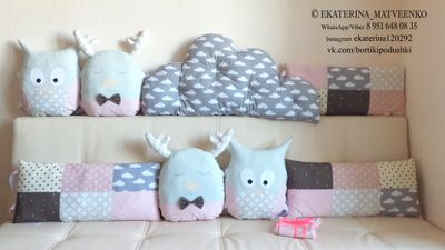 Комплект в кроватку-домик из 100% хлопка Европейского производства. Внутри холлофайбер высшего сорта. Ленты репсовые. Любой зверёк по 700 руб. Лоскутные подушки и облака по 700 руб. WhatsApp&Viber 89516480835
