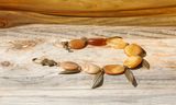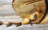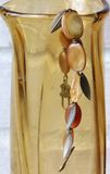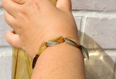 На запястье около 18 см. Материалы: перламутр, агаты, рог, цитрин, металлофурнитура под бронзу. Монохромный браслет из овальных элементов в золотисто-коричневых оттенках.