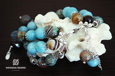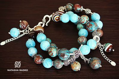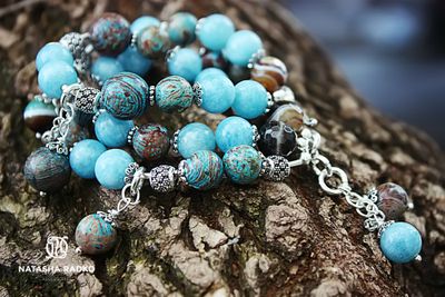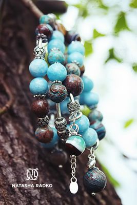 Глядя на этот браслет, муж моей подруги сказал: "Да, невероятные штуки ты создаешь! ". Столько восхищения было в его словах, чаще нужно мужчинам показывать такие цацки. Мужское признание-оно так по особенному для меня звучит. Меня проперло на тройные браслеты. Этот браслет тоже для меня любимый. Хотя я так, конечно про все могу сказать, я ими любуюсь, играюсь, экспериментирую. Мне нравится сочетать камни не только по цветовой палитре, но и подбирать так, чтобы те свойства, что несет камень раскрывали потенциал в его хозяйке, оберегали, защищали, дарили радость, были наполнены внутренней, магической, очень тонкой красотой, которую не видно глазу, но котороя всегда, всегда чувствуется, когда вы одеваете ваше изделие. Я знаю, что у меня классно получается передавать состояния. Те состояния, в которых мне хочется творить. Мама с папой зашли сегодня в гости и увидели весь мой хаос. Папа: " мда, доча, эко тебя понесло, у тебя между прочим вредная работа". Я недоуменно, мол, во-первых-это не работа, и ради интереса, чем это она вредная? На что он мне из своих концепций и убеждений: " зрение портится". Не сильно люблю спорить с родными, берегу нервы)).Я смеюсь в душе. Ну как может портиться зрение, когда с такой красотой вокруг. Когда смотришь и любуешься, и такая приятная легкость и радость за то, что нашла себя в этом. Этот браслет станет оберегать свою хозяйку. Яшма один из сильных камней по таким делам. Девушки, если вы чувствуете, что вам необходима защита и оберег, тогда он самое то! Голубой кварц располагает к внутреннему познанию и принятию себя. Камни: пейзажная яшма, голубой кварц, в серебре.