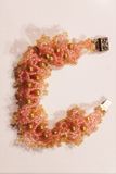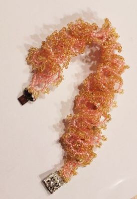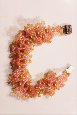 Сложное плетение, фигурный замок. Бисер: чешский. Цвет: светло-розовый и золотой. Длина: 18 см.