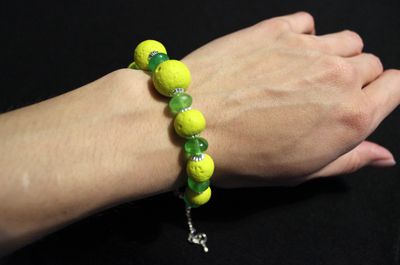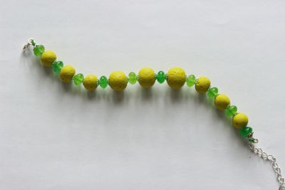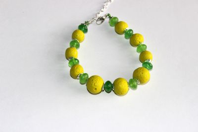 Летний браслет в оттенках зеленого. Бусины из полимерной глины желто-зеленого цвета выполнены в соляной технике, при применении этой технологии бусины приобретают интересный неповторимый рисунок и текстуру. Так же в браслете использованы стеклянные зеленые бусины различных оттенков.
