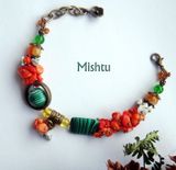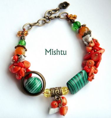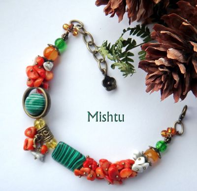 Браслет из коралла, агата, кахолонга, имитации малахита, турквенита.