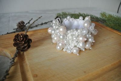 Выполнен на основе фетра.Расшит бисером,крупным и мелким жемчугом.Смотрится на руке массивно и в тоже время нежно.