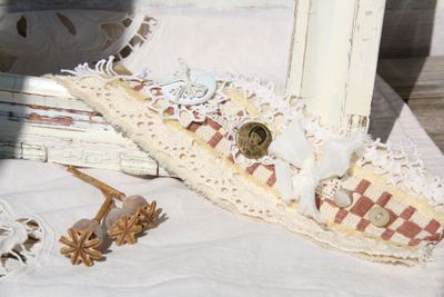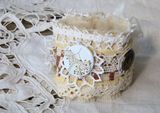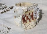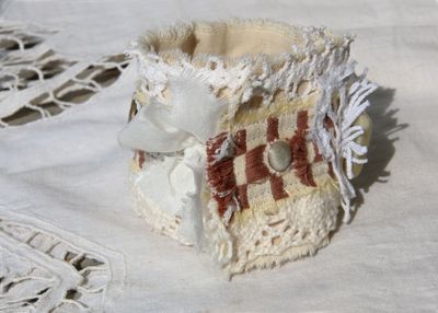 Шеби-браслет - нежный и небрежно-растрепанный, в оттенках молока с каплей шоколада. Украшение создано из шитья, кружева, льна и пуговиц, частью современных, частью из «бабушкиного сундучка». Одна из пуговиц латунная с изображением девушки в стиле ретро. На запястье 17-20 см., ширина 7 см. Материалы: хлопковое кружево, лен, пуговицы, шелк. Браслет застегивается на пуговички: на 1-ю – на запястье 17-18 см., на 2-ю – 19-20 см.