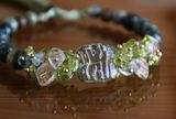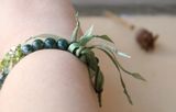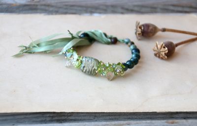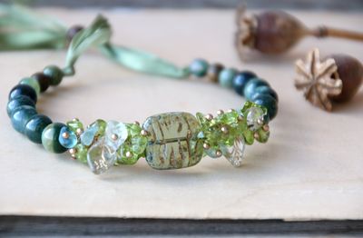 Изящный браслет в оттенках зеленого из чешского стекла и натуральных камней. В браслете присутствуют бусинки бакаута, издающие легкий аромат. Если длина шелковой «травы» не соответствует настроению, то ее можно подложить под браслет и носить с хвостиками сбоку. На запястье 16-18 см. Материалы: стеклянные бусины, флюорит, хризолит, халцедон, змеевик, бакаут, шелковые ленты. Мидори в переводе с японского означает «зеленый».