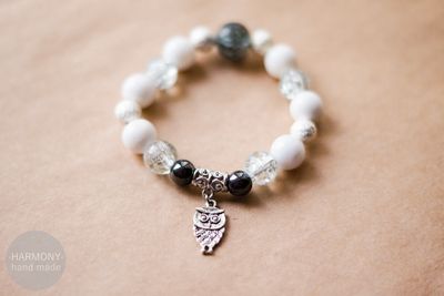 Сова - символ мудрости и рассудительности, а наша сова к тому же еще и милашка ;) В браслете использованы бусины из оникса. Считается, что оникс лечит нервные заболевания, депрессию, снимает негативные последствия стрессовых ситуаций, избавляет от бессонницы и ночных кошмаров.