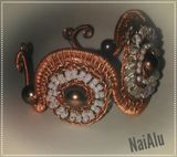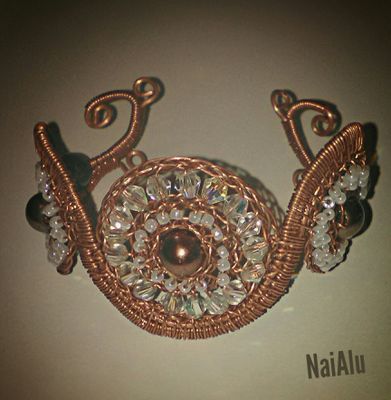 Медь,стекло, пластик. 15 см длина, диаметр центрального круга 3,5см, диаметр бусин 0,6см. Легкий, регулируемый браслет. Подойдёт как для праздника,так и в качестве ежедневного украшения.