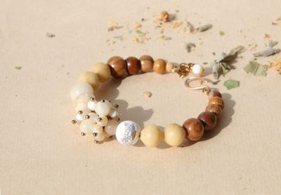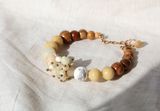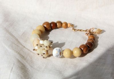 Тонкий браслет из натуральных материалов в оттенках топленого молока и слоновой кости. В центре браслета, рядом с бусиной из фарфора с рисунком, гроздь из перламутра и кальцита, затем винтажная кость и завершают браслет деревянные бусинки из яблони, вишни, желтого дерева. Застегивается на простой замочек-крючок из бронзы. На запястье 16-17 см. Материалы: перламутр, фарфоровая бусина, кость, кальцит, винтажное стекло, яблоня, слива, желтое дерево.