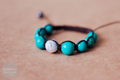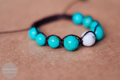 Браслет из говлита (под бирюзу) и кахолонга. Моя личная ассоциация с этим браслетом: бескрайнее голубое небо и одинокое облачко ☁ Говлит помогает своему хозяину овладевать знаниями и навыками; он постоянно подталкивает своего хозяина к профессиональному совершенствованию. Кахолонг издавна считался талисманом любви, привлекающим к женщине сердца мужчин. Также он избавляет от вспышек опасного гнева и приступов меланхолии.