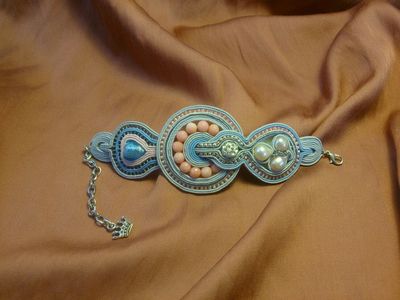 шнур сутажный, жемчуг речной, розовый кварц, шамбала, муранское стекло, бисер японский.