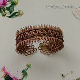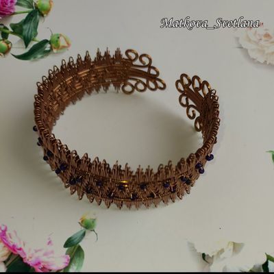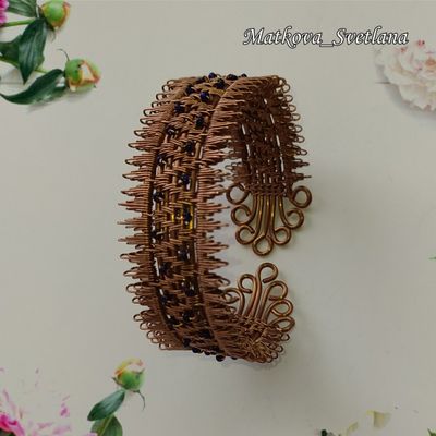 Браслет выполнен из медной проволоки в стиле Wire wrapping с использованием бисера. Браслет без застёжки поэтому подойдёт на любой размер. Во избежание окисления изделие покрыто лаком.