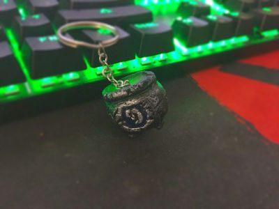 Брелок отлит из прочной пластмассы. Покрашен акриловыми красками, сверху котла, и знак hearthstone пролиты эпоксидной смолой.