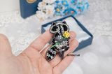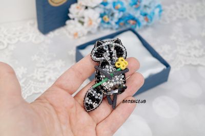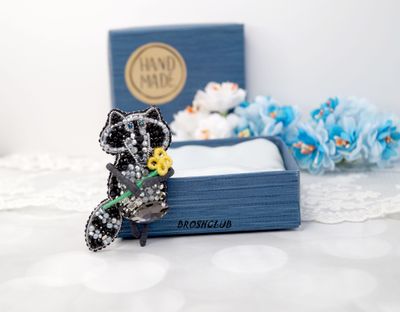 Авторская брошь черного цвета Енот с цветком выполнена в смешанной технике. Расшита бисером прециоза, чешскими гранеными бусинами и кристаллом премиум класса. Все дополнительные элементы изготовлены из жесткой проволоки, сохраняющей свою форму. Изнанка оформлена из искусственной кожи, которая вызывает дополнительное антистрессовое желание постоянно ее гладить. Размер 6,5*4 см В покупку входит: брошь, коробка, инструкция по уходу и хранению, салфетка для ухода, бирка, благодарственное письмо, открытка-сюрприз