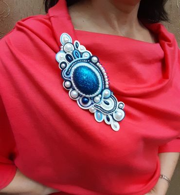 Брошь выполнена в технике сутажная вышивка с использованием кабошона из эпоксидной смолы, бусин и бисера. Не смотря на размер сутажные украшения чрезвычайно лёгкие , ведь сутаж практически ничего не весит, вес зависит от количества и размеров кабошонов, бусин и бисера используемых в изделии.