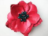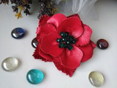 Выполнено вручную из качественных материалов. Сердцевина вышита бусинами. Материал: натуральная кожа (Турция) Цвет лепестков: кораллово-красный Цвет сердцевины: изумрудный Диаметр броши: 8 см