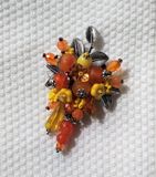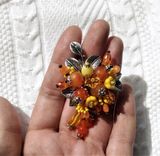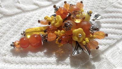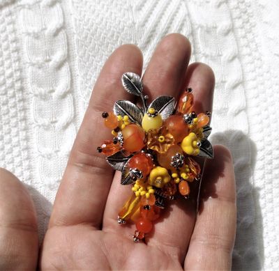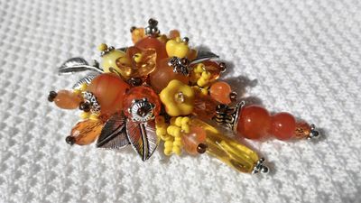 Брошь "Медовый Спас" с металлофурнитурой под серебро, с чешским бисером и чешскими стеклянными бусинами, с тонированным агатом "вены дракона". Центральная часть броши собрана на ювелирный тросик, боковые элементы из бисера и бусин в виде сердечка собраны на проволоку, подвески надёжно закреплены к основе. Не подходит для лёгких тканей. Размер 5х7см.