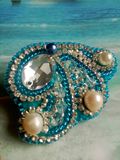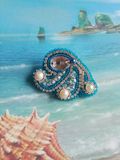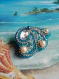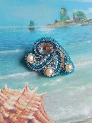 Оригинальная брошь, вышитая бисером, жемчугом и стразами. Необычный силуэт напоминает изящного осьминожка, а цветовая гамма напоминает о морских пейзажах: сияние крупных и мелких страз идеально сочетается с молочной белизной жемчуга и нежно-голубым бисером. Изнанка броши выполнена из натуральной кожи. Размер: 55*43 мм. Осьминожек идеально сочетается с натуральными и синтетическими тканями. Он станет отличным украшением Вашего образа или подарком для самых любимых.