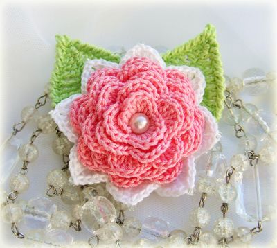 Брошь связана из 100% мерсеризованного хлопка. Сзади пришиты два листика. Середина броши украшена бусиной. По краям белых лепестков ввязан бисер, имитирующий капельки росы. Смотрится очень нежно. Украсит любой наряд и придаст ему свежести.