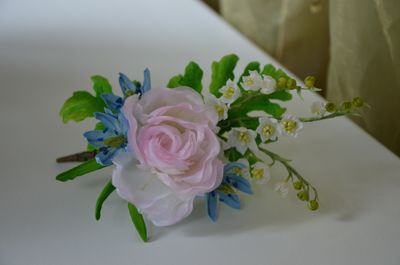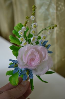 Букетик из нежно-розовой розы, пролески и ландышей из японского шелка в виде броши-бутоньерки. Невозможно оторвать взгляд от этих простых, нежных и очень красивых весенних цветов. Брошь-бутоньерка прекрасно впишется в ваш романтический образ.