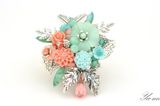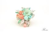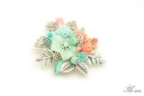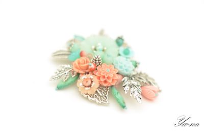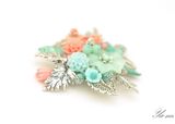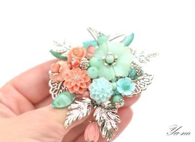 Брошь "Кораллово-мятная" -это композиция из цветов,бусин, листьев из перламутра и серебристой металлофурнитуры. Брошь легкая,можно надевать на легкие ткани. Так как здесь нет клея, то ее можно не бояться намочить. Подойдет для пальто, джемперов, платьев, шарфиков и куда еще подскажет фантазия. При покупке любых двух изделий, доставка по России в подарок. В остальные страны мира обговорим индивидуально. Под заказ точного повтора не будет. Вы станете единственной обладательницей такой броши. Материалы: бусины, перламутр, цеточки, пластиковые элементы, металлофурнитура, бисер Размер: 7 на 7 см