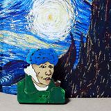 Брошь по картине Ван Гога «Автопортрет с отрезанным ухом и трубкой» (1889 год) Обостренное восприятие действительности и душевная неуравновешенность приводят Ван Гога к психическому заболеванию. Гоген приезжает погостить в Арль, но творческие разногласия вызывают ссору. Ван Гог кидает стакан в голову художника, затем, после заявления Гогена о намерении уехать, бросается на него с бритвой. В припадке сумасшествия вечером этого же дня художник отрезает себе мочку уха. Материалы: дерево, акрил, лак, булавка.