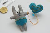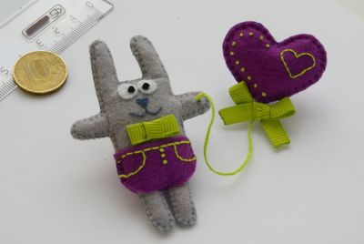 Брошь "Зайка с шариком" - это двойная брошь с застежкой как на самом зайке, так и на шарике-сердечке. Штанишки украшены вышивкой, а шарик - бисером и бубенчиком. Данная брошь станет отличным подарком на любой праздник!! Штанишки несъемные))) Материал: фетр, бисер, репсовая лента, синтепон. Размер: зайка - 7,5 х 5,5 см, шарик - 3 х 4 см