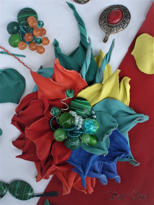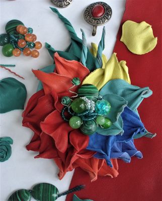 Натуральная кожа, агат, хризопраз, малахит, кварц, чешский бисер и камни и др. Размер 13*9 см.