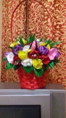 Корзинка с тюльпанами из атласных лент. Подарок , который долго не завянет.