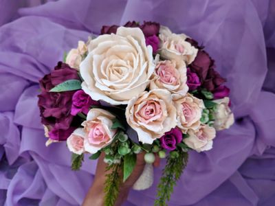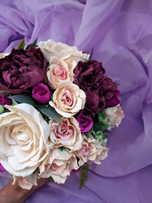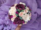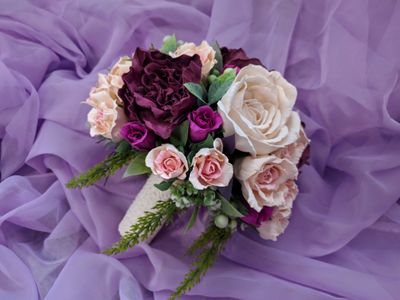 Нежнейшие мелкие розы чайного цвета, крупные пионовидные розы глубокого фиолетового цвета, прекрасно дополнены насыщенными бутонами цвета фуксии. Букет легче живого аналога. Цветы из фоамирана ручной работы
