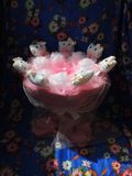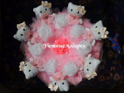 Букет выполнен по авторской технологии. Исключительно ручная работа. Служит оригинальным подарком, состоит из семи игрушек, семь роз (сделанных из ткани). В центре дополняет композицию цветок канзаши из атласных лент.