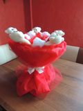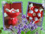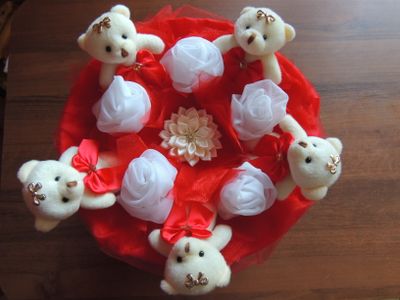 Букет выполнен по авторской технологии без применения искусственных цветов и бумаги. Все элементы выполнены из ткани или атласных лент.