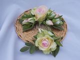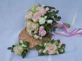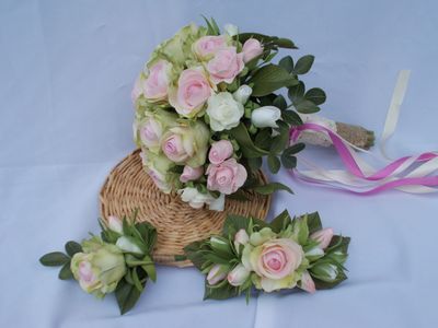 Комлект состоит из свадебного букета, бутоньерки и гребня для волос, изготовлен из фоамирана. Декор ручки - мешковина, кружево х/б, атласная лента.
