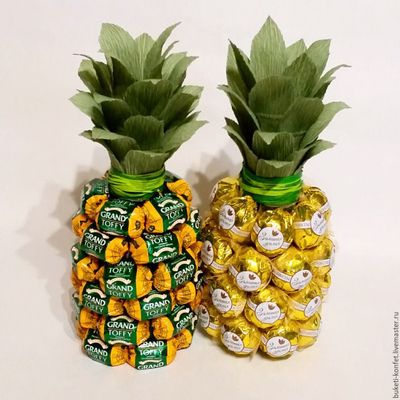 Букеты из конфет разных форм размеров и содержания а так же бутылочки/ананасы/елки/и в платьях