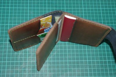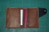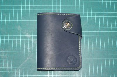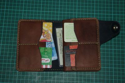 Пошит из натуральной кожи краст толщиной 1,5мм двух цветов. Снаружи темно-синий, изнутри коричневый. Хлястик защелкивается на клямерную кнопку. Имеет 4 кармашка под карты, 2 кармашка под мелкие документы, один глубокий карман и 2 кармашка под паспорт и большие документы. В закрытом виде размером с обложку для паспорта.
