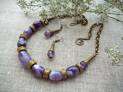Бусы и серьги из аметиста с ювелирной огранкой на бронзовой фурнитуре. Серия "Пробуждение" Длина бус 52 см Серьги 5 см