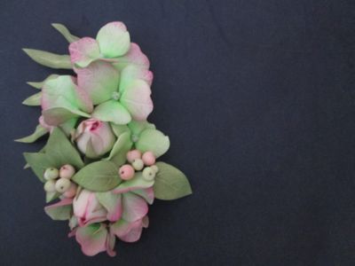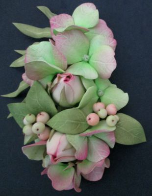 Небольшие бутончики роз в сочетании с цветами гортензии, ягодками снежноягодника из полимерной глины и веточек перечного эвкалипта прекрасно сочетаются в одном изделии. В основе брошь-булавка