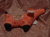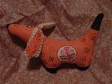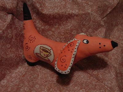 Сувенир ручной работы. Рыжая такса из х/б с ручной росписью и декупажем(чашка и пирожное). Подарит уют и станет отличной домоседкой))).