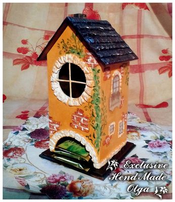 Домик для чайных пакетиков со съемной крышей оформлен в технике декупаж. Такой чайный домик украсит любое чаепитие и будет прекрасным дополнением к интерьеру вашей кухни.