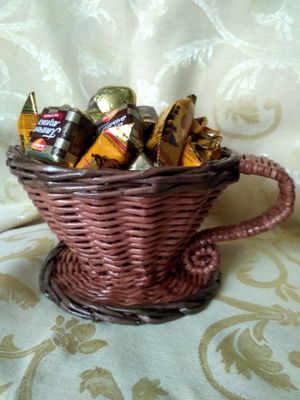 Чашка-конфетница. Создаст настроение на вашей кухне. Сплетена из бумажной лозы. Обработана акриловым лаком безопасным для пищевых продуктов. Не боится влаги. Высота 12см, диаметр 16 см. Может быть изготовлена в вашем цвете.