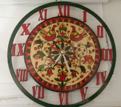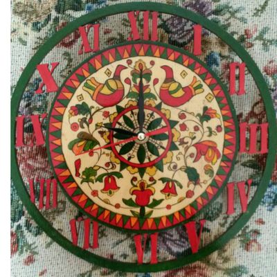 Ручная работа. Пермогорская роспись по дереву. Часы со встроенным механизмом.