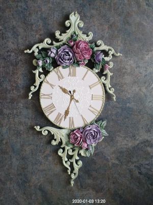 Часы настенные, скульптурная живопись декоративной штукатуркой с армирующим волокном, после высыхания очень прочный материал, объемные декоративные элементы покрыты жидкой поталью, обьемный орнамент, цифры и стрелки ручной работы с филигранью, покрыты жидкой поталью. Декоративные элементы лежат на резной заготовке, вырезанной конкретно под эти элементы. По вертикали -80 см, диаметр циферблата -30 см Авторские настенные часы ручной работы.
