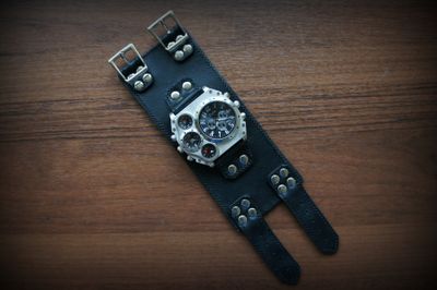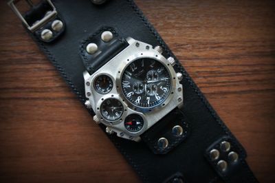 Часы наручные мужские с двумя циферблатами, термометром и компасом. Выполнены из натуральной кожи, с декоративной строчкой ручным швом вощеной нитью. Стильное решение, которое дополнит ваш образ и привлечет внимание окружающих! Механизм: японский кварцевый Корпус: Нержавеющая сталь Сборка: Гонконг Ремешок: широкий браслет 7 см из натуральной кожи + застежки-пряжки