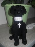 собака связана крючком из акрила, статична, сидит, подогнув одну лапу под себя, размер игрушки примерно 15 см, наполнитель - синтепон, украшение на груди - крестик настоящий, но не серебряный