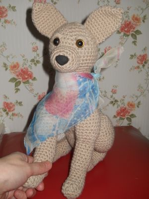 собака связана крючком из акрила, украшена шарфиком, размер игрушки примерно 30 см, статична, сидит, на правом бедре белое пятнышко