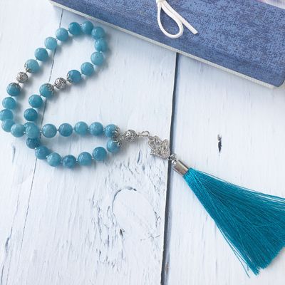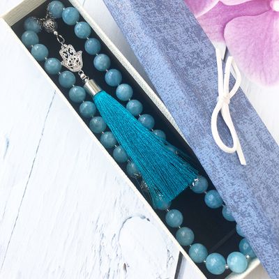 Чётки из натурального аквамарина с ювелирной фурнитурой с цирконами , кисть из вискозной нити, ручной работы