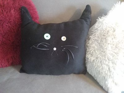 Декоративная подушка "Черный кот". Из черного флиса, наполнитель - синтепон. Обьемные усики из кожаной ленты. Отлично подойдет к любому интерьеру. Размеры 45*45.